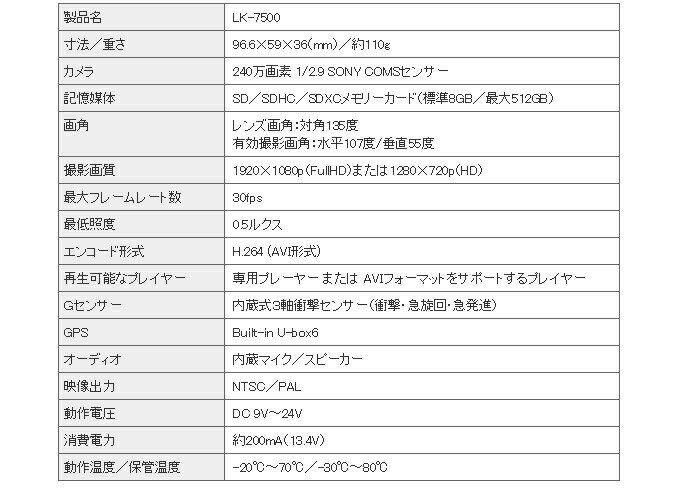 仕様 (スペック)【INBYTE】SDXC対応 Sony Exmor CMOSセンサー搭載フルHDドライブレコーダー LUKAS LK-7500