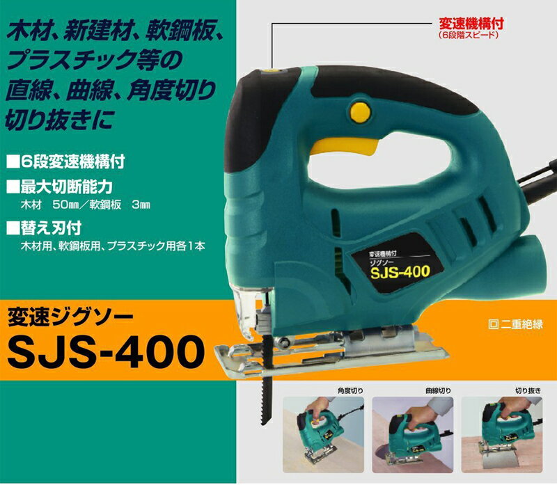 ●切断能力:木材50mm・軟銅版3mm・アルミ5mm ●ストローク数:800〜3.000回/分 ●傾斜切断:0〜45度 ●電圧:100V ●周波数:50/60Hz ●消費電力:400W ●電流:4.3A ●電源コード:2m ●質量:2.1kg ●標準付属品:ブレード×3、六角レンチ、接続パイプ