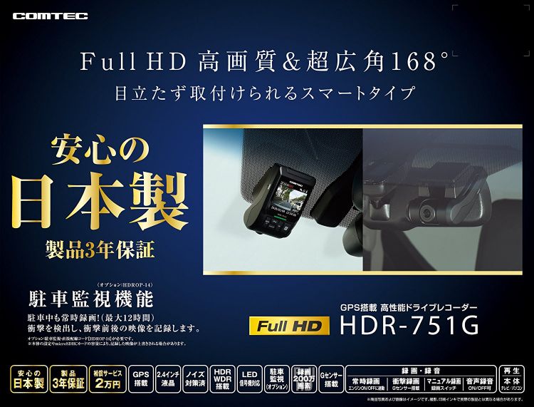 ・超広角レンズ採用 対角168° ・速度監視路線警報機能 NEW ・レーダー探知機相互通信対応 ・HDR/WDR機能搭載で夜間映像が綺麗! ※白とび黒つぶれ、逆光にも強い! ・1/2.7インチ大型イメージセンサーで夜間でも明るく撮影! ・地デジやナビへの影響を抑えたノイズ対策済! ・GPS機能搭載 ※速度情報、位置情報の記録、表示。